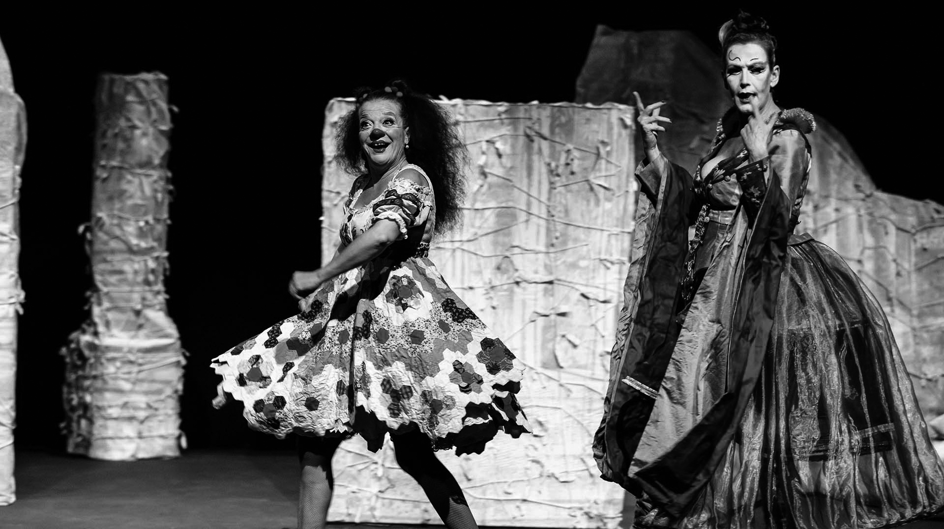 Veus que no veus presenta la versió femenina de les anomenades “entrades clàssiques”, els números que inicien un espectacle o enllacen escenes. Per una banda, i com a pallassa augusta, la Pepa Plana. Per l’altra, en el rol de pallassa blanca, la Clara del Ruste. Com canvien i quin significat prenen quan es juguen des de dues pallasses en comptes de dos pallassos? La companyia de Pepa Plana sempre ha reivindicat la figura de la pallassa i ara presenta els números circenses més clàssics. Es tracta de riure? Sí, però no només d’això, sinó de parlar, jugar i, potser, mossegar.